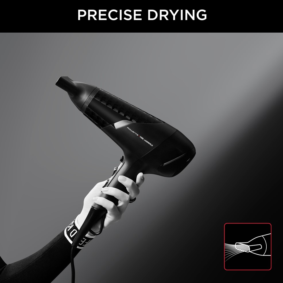 Rowenta Karl Lagerfeld CV581LF0 fen za kosu.Snaga 2300W.Thermo Control funkcija štiti kosu od suvišne topline.Lako podesiva kontrola brizine i temperature sa tankim koncetratorom za stilizovanje najsitnijih detalja.